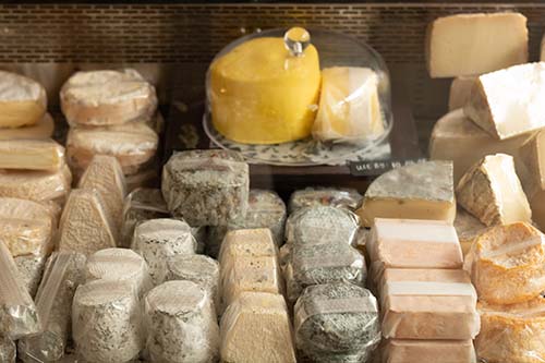 We have around 70 varieties of British and European cheese in our onsite maturing rooms and we bring a selection of these up to our cheese counter depending on what is ready to eat and tasting great.