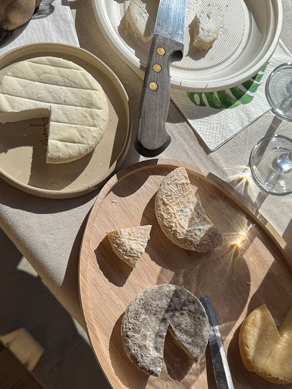We sample the traditional Piedmontese delights: vitello tonnato, tajarin with ragù and agnolotti filled with rabbit. Hazelnuts with everything. Despite these strays from the professional brief, it is primarily a cheese-filled few days. Highlights include a fresh cow’s curd made that morning, full of lemony acidity; countless different ageings of Robiola goats’ cheese, from minutes old, tart and lactic, to fluffy, creamy and full-flavoured as we know it, to looking somewhat forgotten with a coat of grey moulds from months in maturation, but tasting great, concentrated and intense; a sunflower-yellow cheese infused with turmeric that shouldn’t work but really does, the spice not overshadowing the flavour of the cheese and the milk. We also visit Borgo Affinatori, a cheese-maturing business with many similarities to Buchanans Cheesemonger (the main difference being our view out the window is of the rooftops of W2 and theirs is of Monviso), where Lorenzo generously shows us round his maturing rooms and delights us with a tasting of revelatory mountain cheeses of the sort we don’t get to see very much in the UK.
